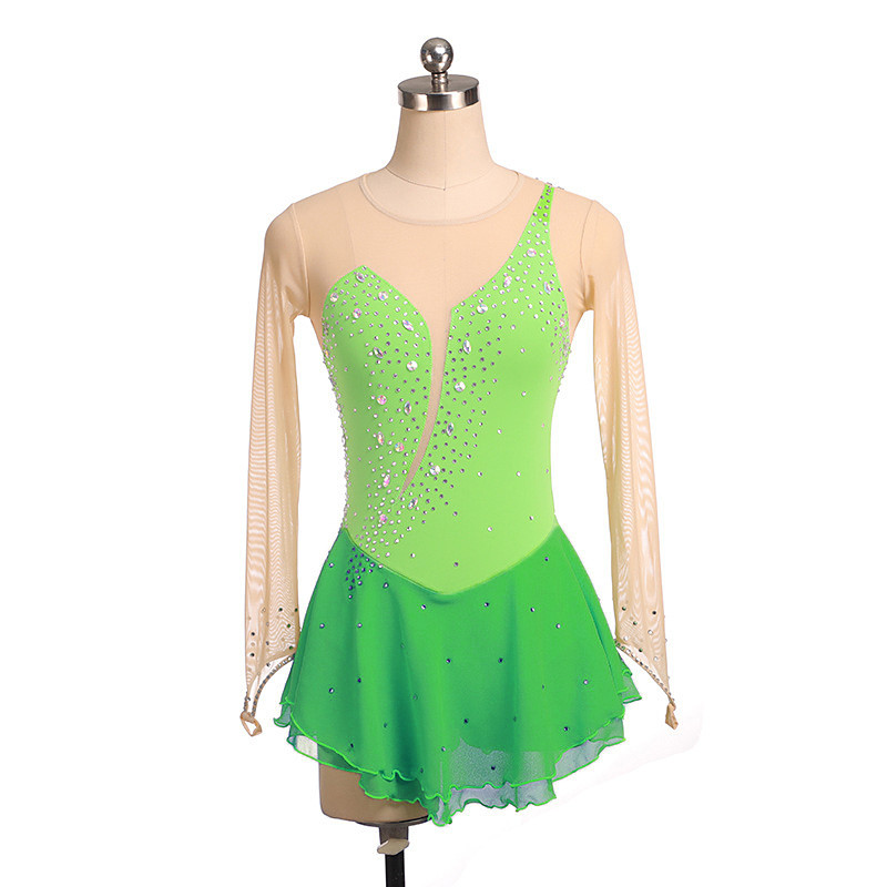 Figure Skating Dress Women's Girls' Ice Skating Dress Pink Green Patchwork Open Back Mesh Spandex Stretchy Training Practice Professional Skating Wear Thermal Warm Classic Crystal / Rhinestone Long