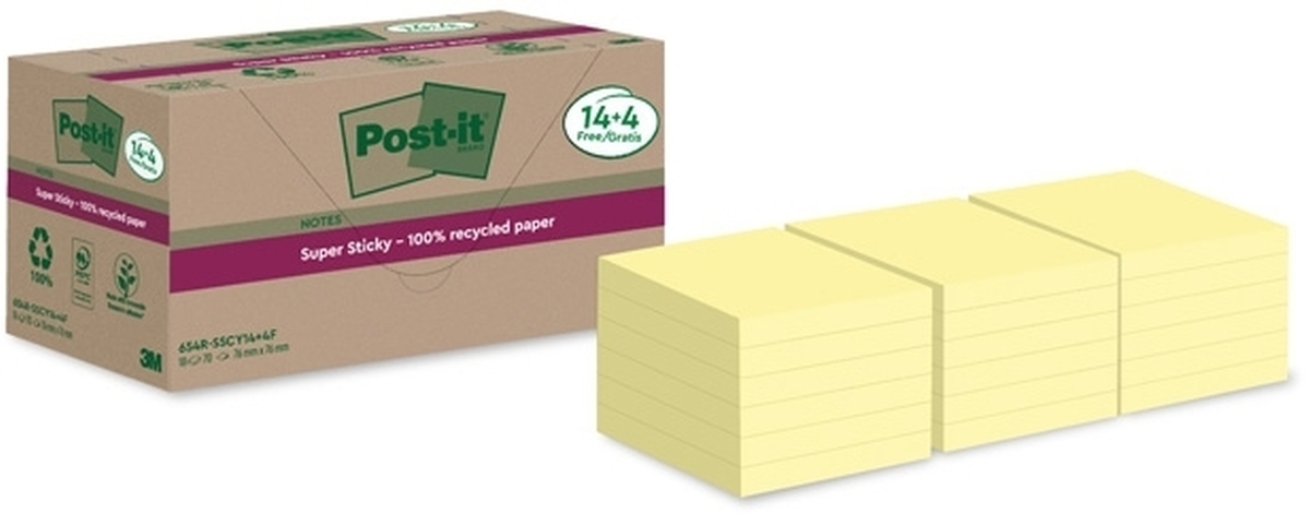 Post-it® Notes Super Sticky 76x76mm Recycled gul 4/fp