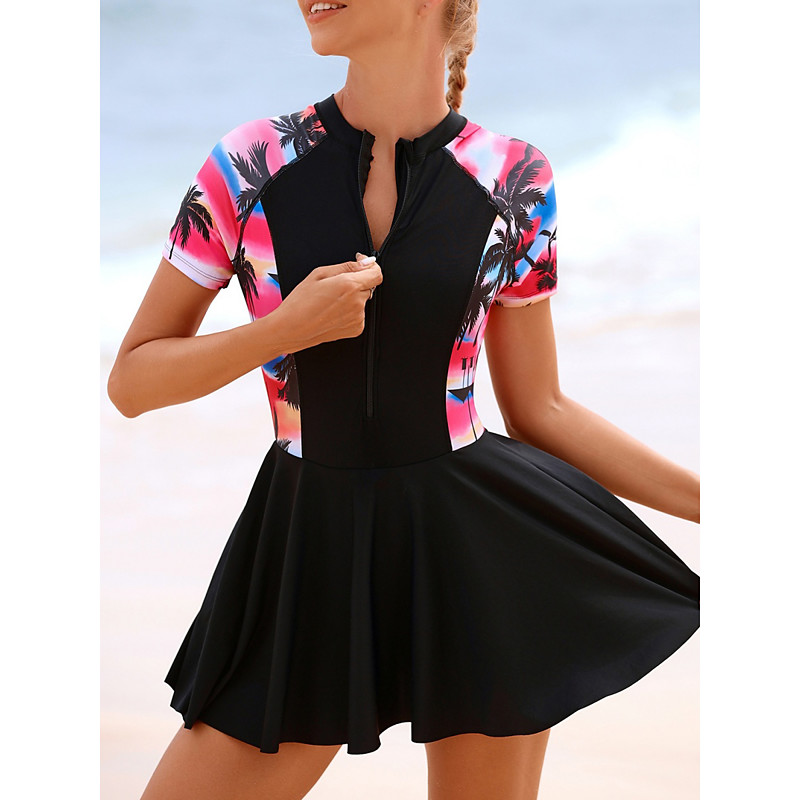 Women's Tankini Swimsuit zip front Palm Dress Briefs Tummy Control High Waist Slim Backless Vacation Beach Wear Graphic Color Block Round Neck Short Sleeves Bathing Suits