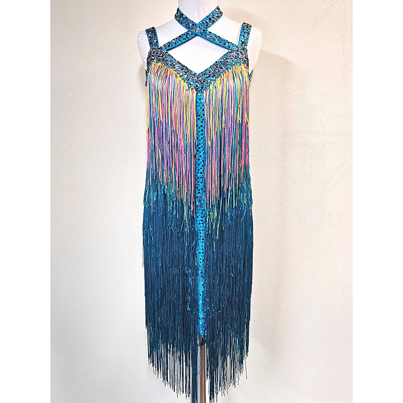 Women's Latin Dance Dress Rainbow Fringe Blue Rhinestone Competition Samba Cha Cha Jive Performance Costume