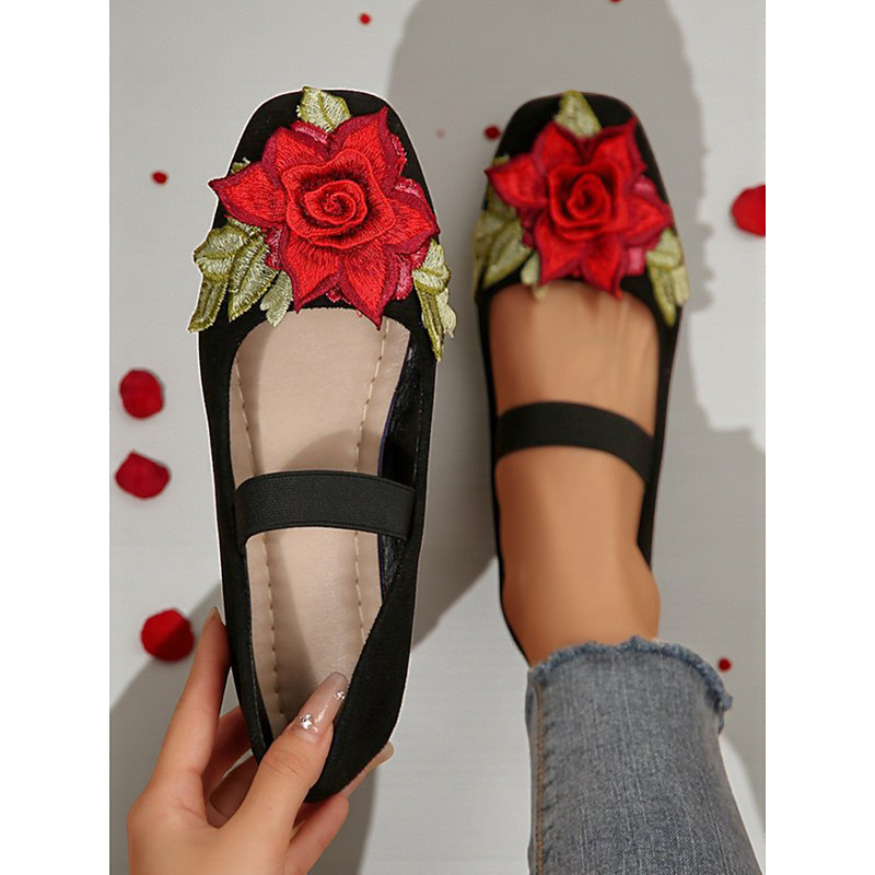 Women's Christmas Mary Jane Flats – Faux Suede Rose Embroidered Strap Shoes for Holiday Party and Daily Wear
