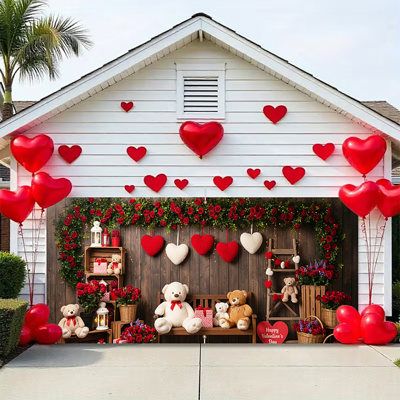 Valentine's Day 2D Flat Print Garage Door Cover, Brown and White Bears with Heart Balloons, Roses, Gift Boxes, Perfect for Holiday Decor, Ideal for Home or Storefront Valentine's Day Decoration