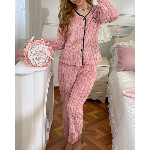 Per donna Pigiama Abbigliamento da Casa Set Pigiama Flanella Caldo Moda Cuore Elastico in vita Bottoni Pantalone Vacanza Casa Quotidiano Manica Lunga Scollo a V Rosa Autunno Inverno Vestibilit