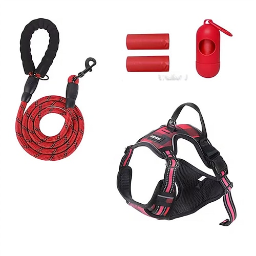 Set di 3 pezzi composto da pettorina antifuga, guinzaglio e dispenser per sacchetti igienici. Gilet morbido, comodo e traspirante con strisce riflettenti notturne, ideale per passeggiate con cani di