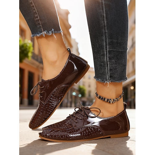 scarpe basse oxford marroni da donna con motivo coccodrillo in rilievo – comode scarpe da lavoro con lacci per ufficio, business casual e spostamenti quotidiani