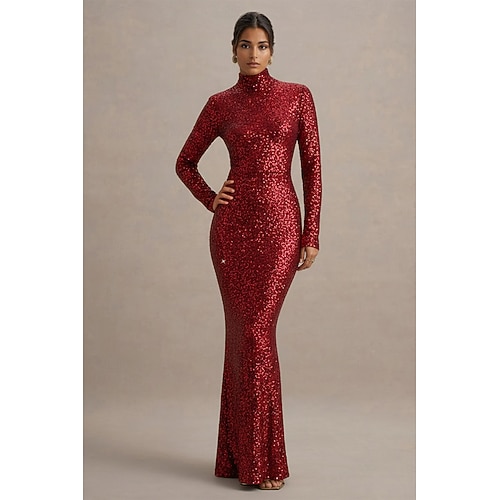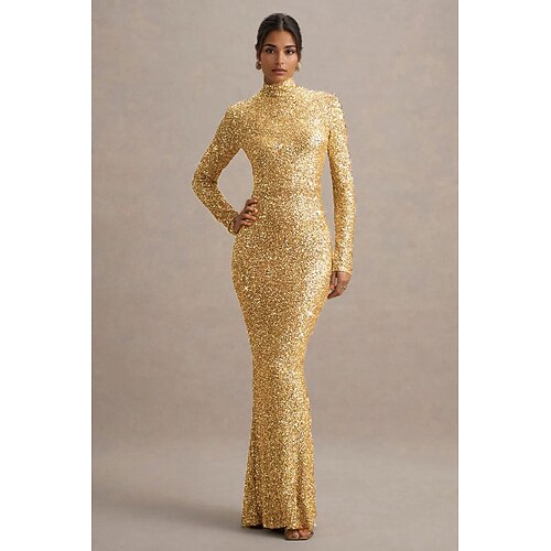 Sirena Tromba Lunghezza al pavimento Abito da Sera Elegante Scintillante Stile Celebrità Manica Lunga Collo Alto Festa in giardino Matrimonio Con Paillettes con Glitter