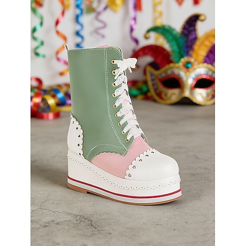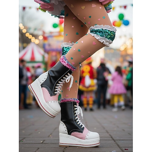 Damenschuhe Mardi Gras mit rose-pinkem Plattform-Wedge-Stiefel mit gewelltem Rand – Süßes Lolita-Stil Schnürschuhe für Anime-Cosplay Karnevalsparaden