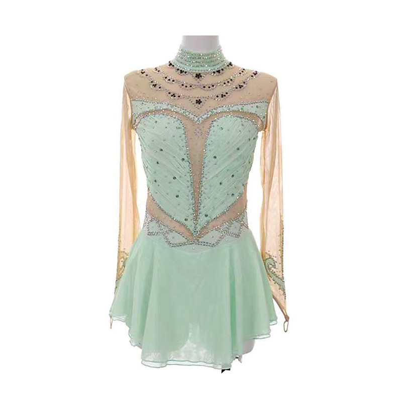 Figure Skating Dress Women's Girls' Ice Skating Dress Green Patchwork Thumbhole Mesh Spandex Stretchy Training Practice Professional Skating Wear Thermal Warm Crystal / Rhinestone Long Sleeve Ice
