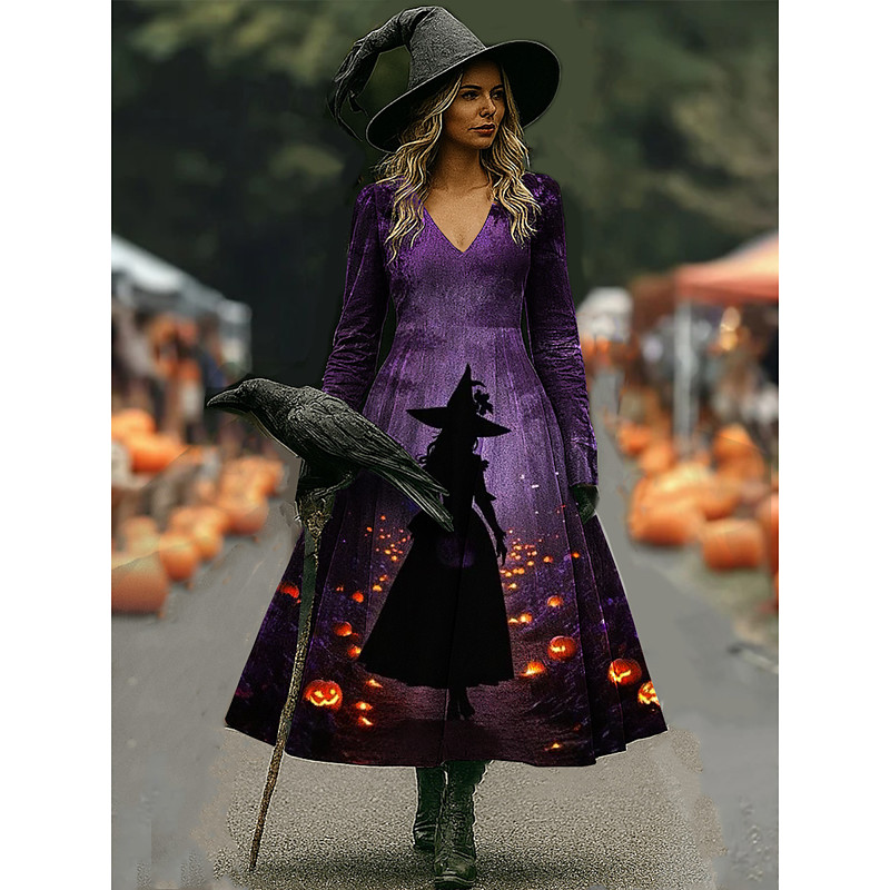 Women's Witch Print Maxi Dress A Line Dress Vacation Casual Boho Beach Regular Fit Floral Graphic Hocus Pocus Long Sleeve V Neck Yellow Dark Green Purple Orange Spring Fall