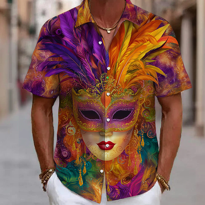 Mardi Gras Men's Dazzle color Carnival Mask with Feathers Shirt Button Up Shirt Short Sleeve Vintage Retro Party Holiday Summer Spring Turndown 3D Print Collared Shirts Purple Orange Dark Purple