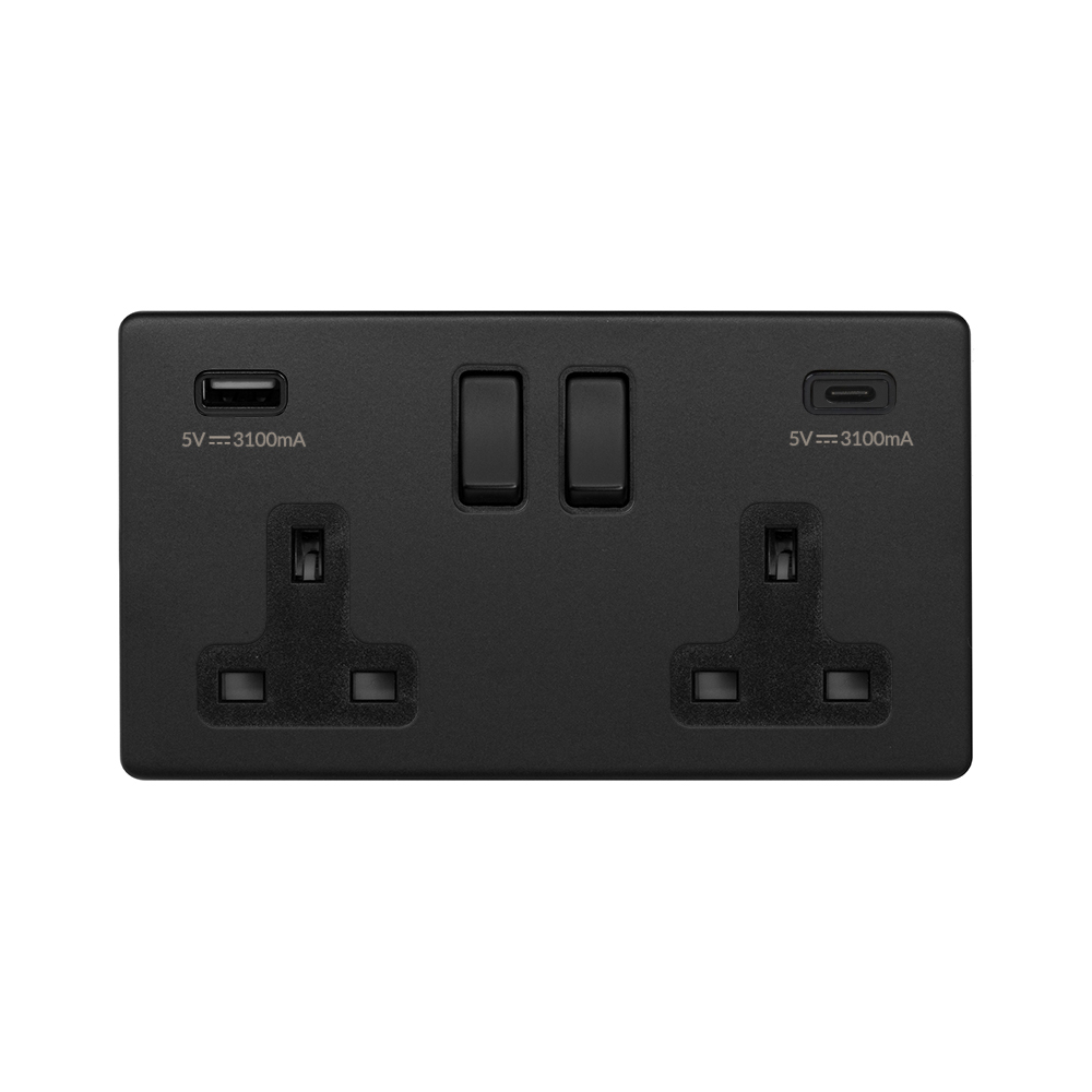 Soho Lighting Matt Black 2 Gang USB A&C Socket (13A Socket + 2 USB Ports A&C 3.1A)