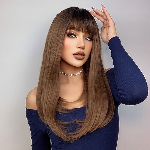 parrucca sintetica naturale dritta con frangetta parrucca 16 pollici marrone ombre capelli sintetici donna naturale moda soffice marrone