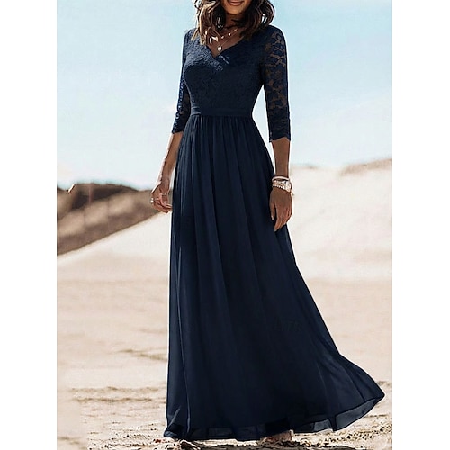 Damen Maxikleid Chiffonkleid Spitzenkleid Weißes Kleid Elegant Urlaub Hochzeit Ferien Normale Passform Einfach Dreiviertelarm V Ausschnitt Weiß Champagner Rosa Marineblau Sommer Frühling