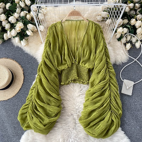 Women's Summer Tops Blouse Dressy Tops Solid Color Plain Elegant Vintage Ladies 3/4 Length Sleeve Shirt Collar Regular Tops Daily Work Going out Ruched Patchwork Pocket Blue Yellow Purple Green Khaki