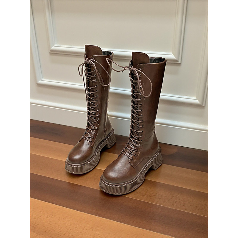 Women's Faux Leather Knee-High Lace-Up Boots with Side Zipper and Chunky Platform Sole, Casual Urban Fashion Footwear