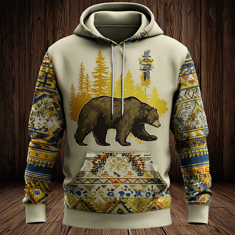 Men's Bear Tribal Pullover Hoodie Sweatshirt Fashion Ethnic Vintage Retro Crew Neck Outdoor Party Gift Travel Blue Yellow Brown Drawstring Fall Winter Designer S M L XL XXL XXXL