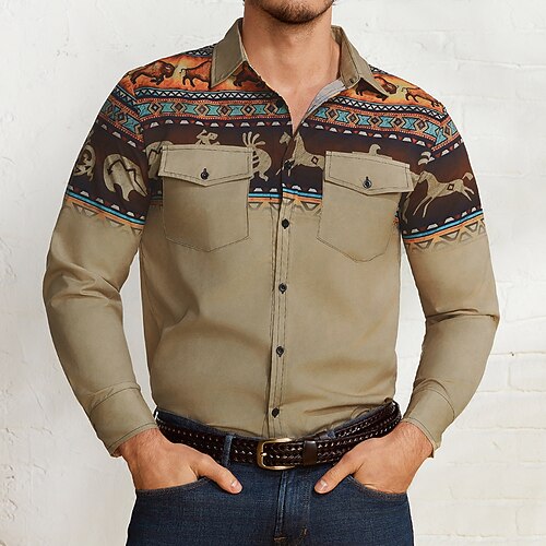 Men's Tribal Graphic Prints Geometry Shirt Western Shirt Cowboy Shirt Long Sleeve Sports Fashion Streetwear Outdoor Daily Fall Winter Turndown Print Button-Down Blue Brown Green Gray