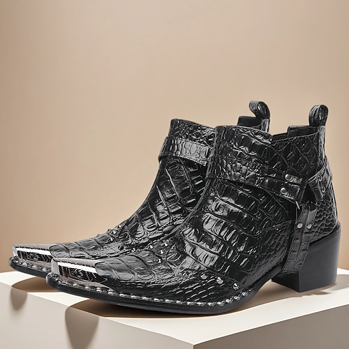 Schwarze Harley-Motorradstiefel für Herren mit Krokodilmuster und Zehenschutz aus Metall, Stiefeletten im Western-Punk-Biker-Stil zum Reiten, für Konzerte und das Nachtleben