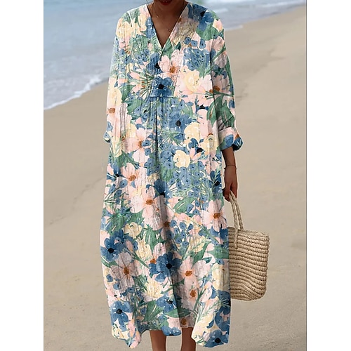 Per donna Abito maxi Abito a trapezio Vacanza Casual All'aperto Uscire Vestibilità comoda Floreale Manica 3/4 Scollo a V Blu Rosso Viola Arancione Estate Primavera Autunno