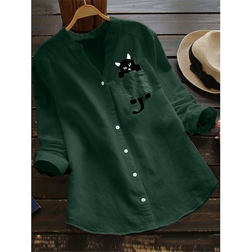 Per donna Camicia Blusa Camicie di cotone e lino Gatto Essenziale Moderno Scollo a V Quotidiano Stampato Bianco Giallo Verde militare Rosso Estate