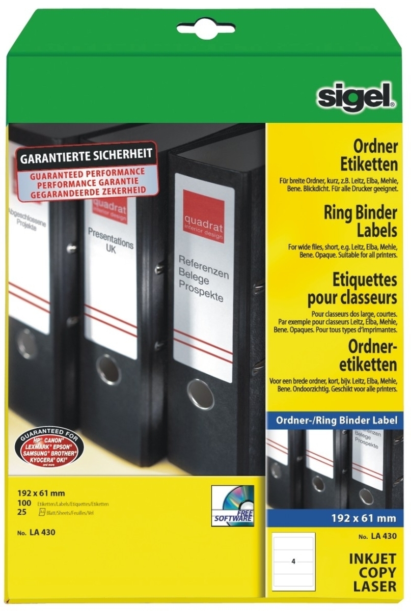 Sigel Ordner-Etiketten Inkjet/Laser Kopier 61x192mm VE=10x100 Stück (25 Blatt) weiß