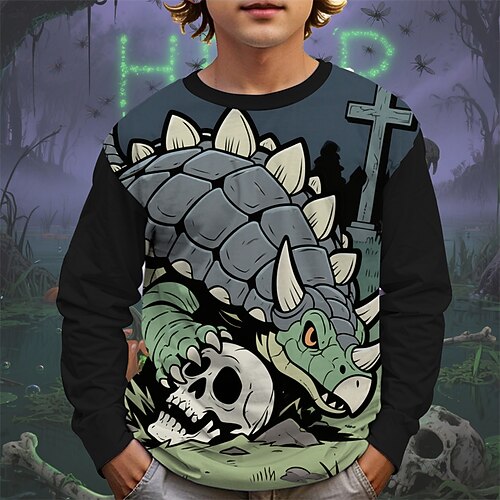 Halloween Jungen 3D Cartoon Kürbis Dinosaurier T-Shirt Langarm Frühling Herbst Mode Basic Kinder 4-12 Jahre Rundhalsausschnitt Outdoor Lässig Täglich Normale Passform
