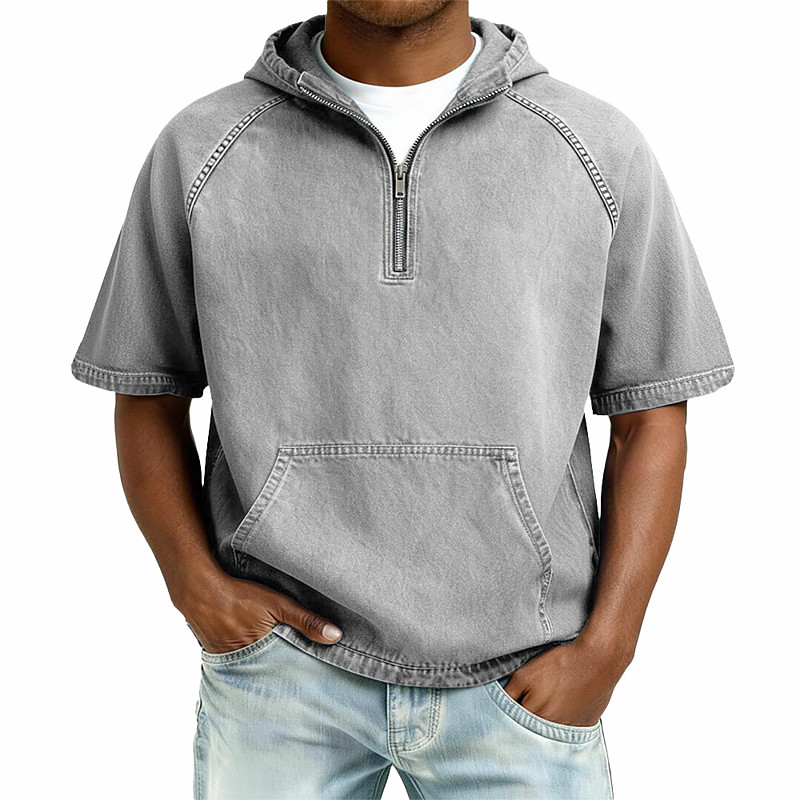 Men Denim Shirt Cotton T Shirt Tee Top Short Sleeve Hooded Summer Spring All Seasons Solid Color Retro Vintage Distressed Zip Up Outdoor Street Causal Light Blue Black Pink Top Tee for Men