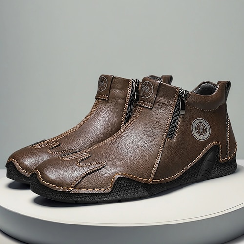 scarpe slip-on da uomo in pelle marrone con cerniera, punta rotonda unica e suola flessibile: calzature casual retrò per viaggi, lavoro e comfort quotidiano