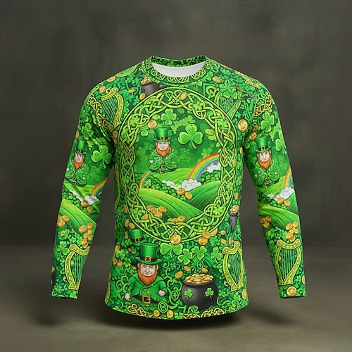 T-shirt a maniche lunghe per uomo per il giorno di San Patrizio, maglietta grafica con trifoglio irlandese fortunato, scollo rotondo con stampa 3D, top per il giorno di San Patrizio