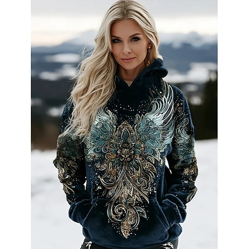 Damen-Pullover-Hoodie mit Wikingerflügeln, grafischem geometrischem Tribal-Muster, Vintage-Stil, Boho-Look, langen Ärmeln, Kapuze, normaler Passform, lässigem Streetwear-Stil, Patchwork-Print,