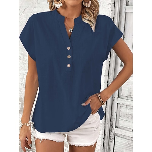 Per donna Camicia Blusa Camicie di cotone e lino Semplice Essenziale Casual Manica Corta Scollo a V Top Regolari Quotidiano Ferie Orlo asimmetrico Nero Bianco Blu Viola Estate
