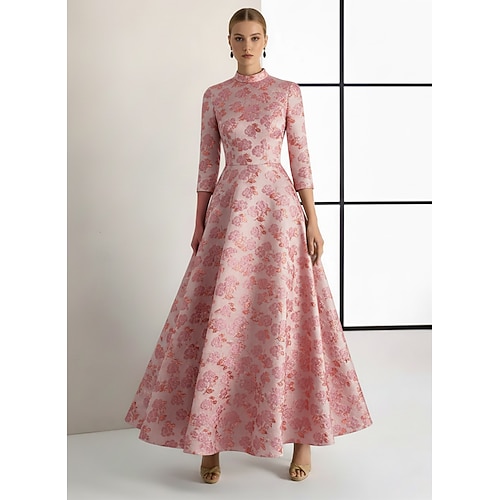 Linea ad A Lunghezza al pavimento Abito da Sera Elegante Vintage Manica 3/4 Collo Alto Matrimonio Formale Nylon Jacquard con Stampa floreale Tasca