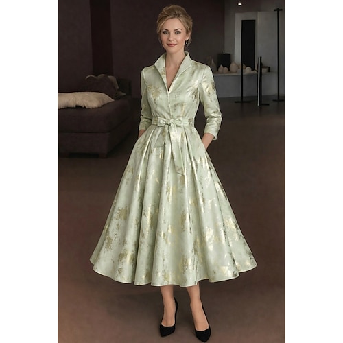 Linea ad A Lunghezza Tè Abito Camicia Abito Formale Abito da sera Abito da cerimonia per signora Manica 3/4 Colletto a Camicia Elegante Vintage Formale Jacquard con Fascia / Nastro Fiocco/Fiocchi