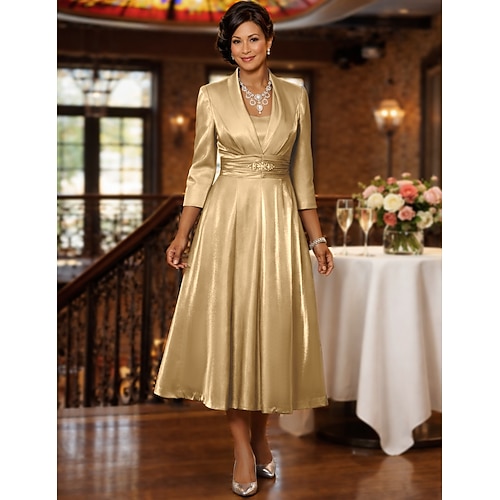 Linea ad A Lunghezza Tè Vestito da Festa Abito da Cocktail Abito da invitata a nozze Abito da cerimonia per signora Manica 3/4 Scollo a V Elegante Formale Serata Formale Ricevimento di matrimonio con