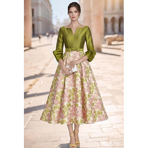 Linea ad A Lunghezza alla caviglia Lunghezza Tè Abiti da Cocktail Abiti da festa Elegante Vintage Floreale Manica 3/4 Scollo a V Festa in giardino Matrimonio Tasca Taffetà Jacquard Shiena scoperta con
