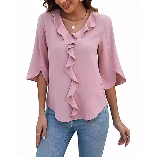 Per donna Blusa Semplice Elegante Manica Lunga Scollo a V Top Regolari Ferie Uscire Volant Nero Rosa Blu marino Azzurro cielo Estate Primavera Autunno