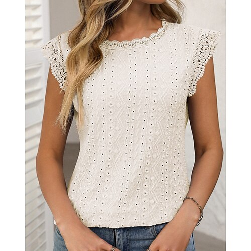 Per donna Maglietta Tinta unica Casual Manica Corta Girocollo Top Regolari Quotidiano Uscire Weekend Pizzo Traforato Blu Nero Bianco Rosa Azzurro cielo Estate