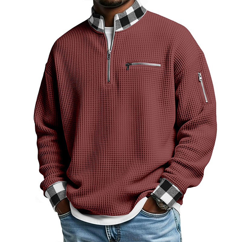 Men's Waffle T-shirt T Shirt Long Sleeve Half Zip Fall Winter Solid Color Traditional / Vintage Casual Check Pattern Color Block Zipper Pocket Casual Home Outdoor Light Blue Light Green Red Top Tee