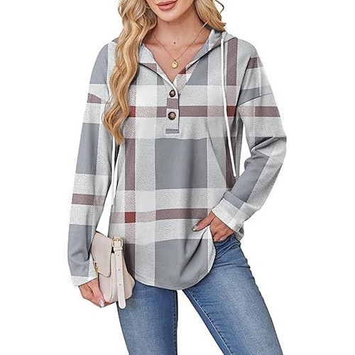 Per donna Blusa Plaid Elegante Casual Manica Lunga Con Cappuccio Top Regolari Quotidiano Bottoni Stampato Blu Rosa Cachi Primavera Autunno Inverno