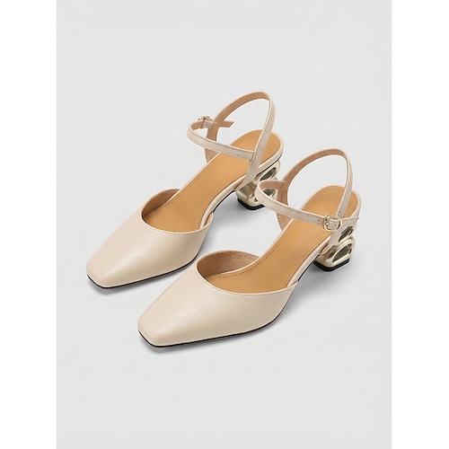 Décolleté da donna color albicocca in vera pelle con cinturino posteriore - eleganti décolleté a punta quadrata con tacco a blocco scultoreo in metallo dorato, perfette per l'ufficio e le riunioni di