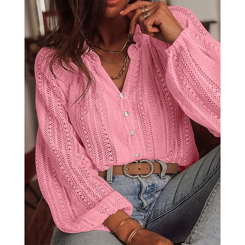 Per donna Camicia Top Eleganti Semplice Elegante Signore Classico Manica Lunga Scollo a V Top Regolari Lavoro Quotidiano Ferie Traforato Bottoni Bianco Rosa Rosso Blu Reale Viola Primavera Autunno