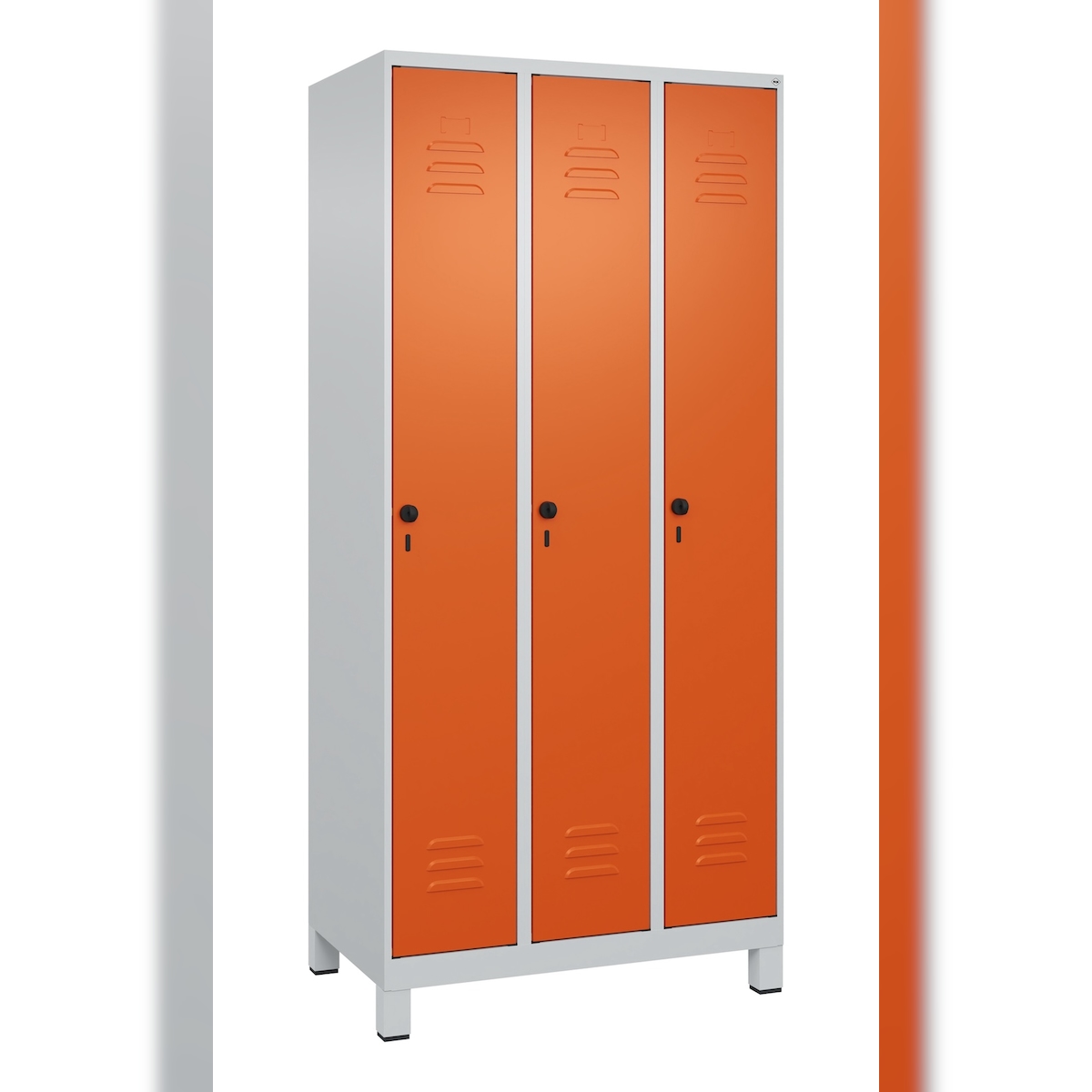 C+P Spind Classic PLUS, Füßen, 3 Abteile, HxBxT 195x90x50cm, Sicherheitsdrehriegel, Hellgrau/Reinorange von PROREGAL