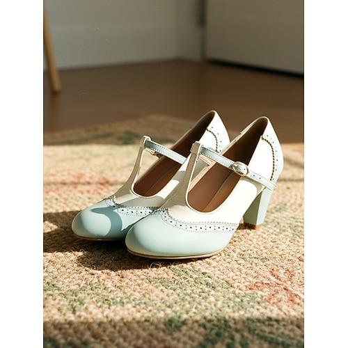 scarpe con tacco a T da donna in stile retrò anni '50, marroni e bianche, con dettagli brogue e chiusura con fibbia: scarpe mary jane vintage per ufficio, feste in giardino ed eventi a tema retrò