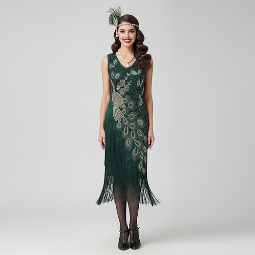 Anni Ruggenti Anni 1920 Abito da cocktail Midi Abito Flapper Vestito Abito da Ballo Normale Senza maniche Il grande Gatsby Charleston Invitato al matrimonio Paillettes Frangia con nappe Scollo a V