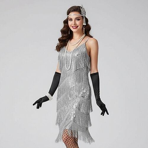 Anni Ruggenti Anni 1920 Lunghezza al ginocchio Abito Flapper Senza maniche Il grande Gatsby Paillettes Frange Scollo a V Costume Per donna Natale Carnevale Mascherata Festa a tema retrò Danza