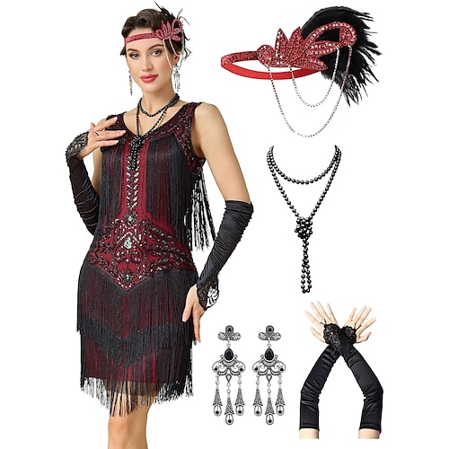 Set Anni Ruggenti Anni 1920 Abito da cocktail Lunghezza al ginocchio Abito Flapper Vestito Abiti con accessori Spalle scoperte Maniche corte Il grande Gatsby Charleston Paillettes Frangia con nappe