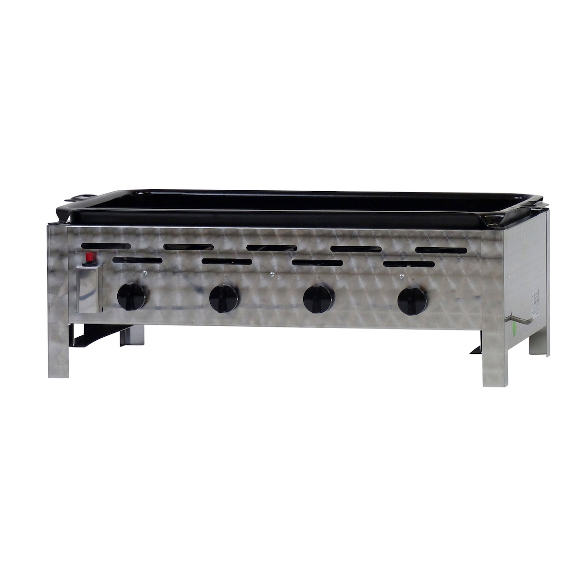 Gastrobräter, 4 Brenner je 4,5 kW, emaillierter Stahlpfanne, B 810 x T 530 x H 270 mm, inkl. Gewerbedruckregler u. Schlauchbruchsicherung