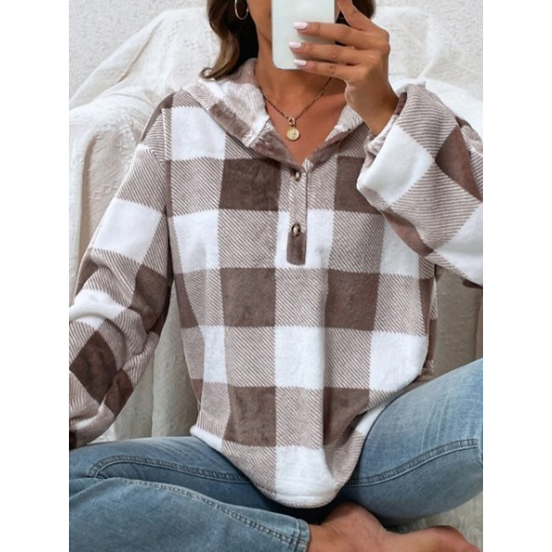 Women's Pullover Hoodie Sweatshirt Plaid Casual Long Sleeve Hooded Regular Tops Street Dailywear Pocket Print Black Brown Khaki Gray Fall Winter