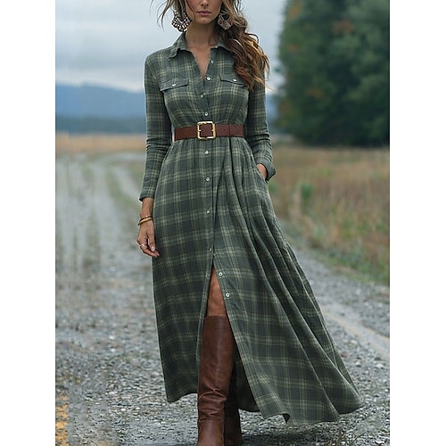 Per donna Abito maxi Abito a Tubino Vacanza Casual Boho Quotidiano Vestibilità regolare Plaid Manica Lunga Bavero Giallo Rosso Verde Primavera Autunno