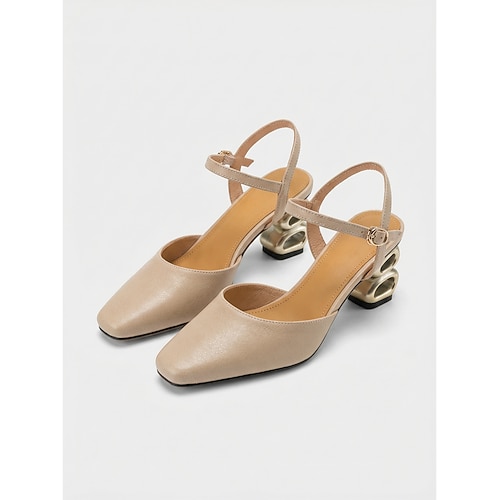 Décolleté da donna color albicocca in vera pelle con cinturino posteriore - eleganti décolleté a punta quadrata con tacco a blocco scultoreo in metallo dorato, perfette per l'ufficio e le riunioni di
